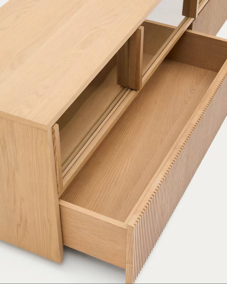 تصميمها يوازن بين الوظيفة والبساطة، لتمنح غرف المعيشة لمسة طبيعية أنيقة وتخزينًا عمليًا للأجهزة والملحقات.